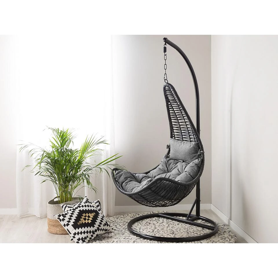 Moderne hangstoel voor binnen en buiten, inclusief kussens. Met zijn licht gebogen frame biedt deze prachtige hangstoel absoluut comfort. Het solide stalen frame garandeert maximale stabiliteit, terwijl het zachte zitkussen dit geweldige meubel nog comfortabeler maakt. De hangstoel past bijzonder goed bij boho- en moderne inrichtingsstijlen en is een fantastische plek om te ontspannen.