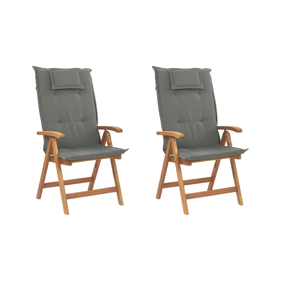 Twee tuinstoelen met zachte grafietgrijze kussens. Met deze praktische en comfortabele stoelen kun je een idyllische hoek op je balkon of terras maken en genieten van lange, warme zomerdagen. Het tuinmeubilair is gemaakt van prachtig acaciahout en heeft een drie staps instelbare rugleuning. De set bevat ook twee bijpassende kussens die een hoog zitcomfort garanderen.