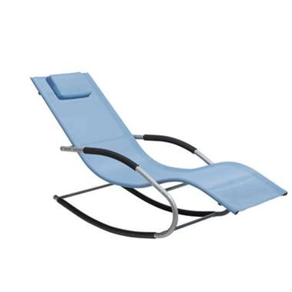 Exclusieve, blauwe ligbed om in te schommelen. Dit ligbed onderscheidt zich door zijn eigentijdse, dynamische ontwerp en zal een blikvanger zijn in elke tuin, balkon of terras. Het is gebouwd met stalen geleiders en uitgerust met antisliphoezen voor een soepele en ontspannende schommelbeweging. De ergonomisch gevormde zitting is gemaakt van stof en heeft een gecapitonneerde hoofdsteun voor extra comfort.