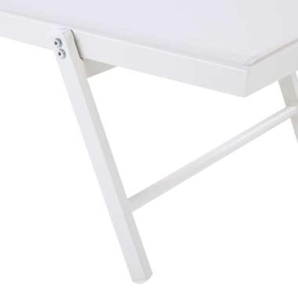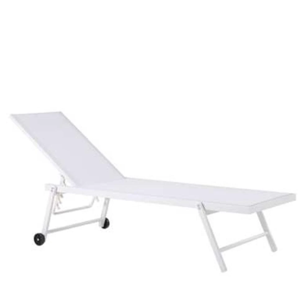 Moderne, verstelbare ligstoel in wit . Geniet van warme, zonnige dagen in je tuin of terras op dit praktische ligbed. Dankzij de verstelbare rugleuning kun je de hoogte van de ligstoel aanpassen aan jouw behoeften. Hierdoor kun je comfortabel zitten en ontspannen terwijl je een interessant boek leest of gewoon gaat liggen zonnebaden. De constructie van de lounger is gemaakt van hoogwaardig en lichtgewicht aluminium, wat in combinatie met ingebouwde wielen ervoor zorgt dat dit tuinbed bijzonder gemakkelijk te verplaatsen is. Het synthetische materiaal dat voor deze ligstoel is gebruikt, is extreem duurzaam en vereist minimale zorg terwijl het tegelijkertijd de moderne uitstraling van het stuk benadrukt.
