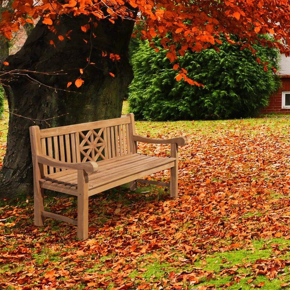 Zo n solide, massieve teakhouten bank is gewoon een deel van elke tuin. Met zijn tijdloze design past deze tuinbank overal perfect in beeld en kan hij ook harmonieus worden gecombineerd met bestaand terras of tuinmeubilair. De licht gebogen bank, de aangenaam liggende rugleuning en de gebogen armleuningen geven de teakhouten bank een ergonomisch zitcomfort. De stevige poten bestaan uit massief houten balken van 5×5 cm dik. Het kostbare houtteak is een extreem hoogwaardig en duurzaam materiaal. Uw teakhouten tuinmeubilair kan daarom zelfs het hele jaar door buiten zijn. Voor permanent onderhoud van de kleur teak worden geschikte onderhoudsoliën aanbevolen, die u desgewenst in de handel verkrijgt.
