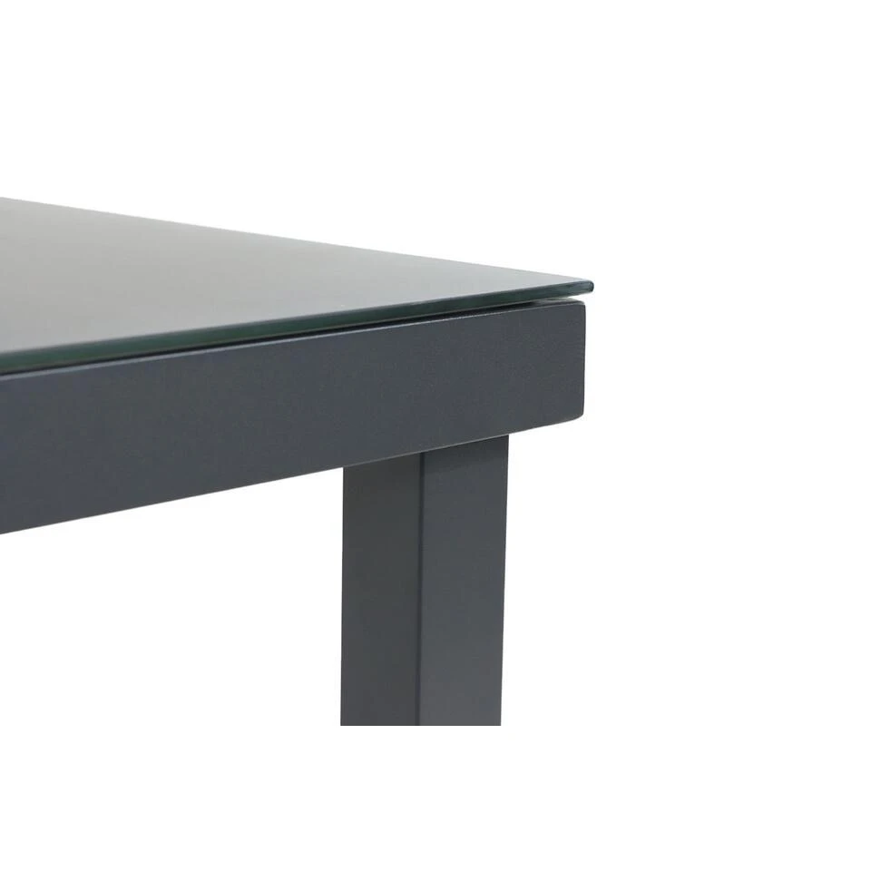 Lifestyle Porto dining tuintafel 90 x 90 cm De prachtige Lifestyle Porto dining tuintafel 90 x 90 cm is een stoere tuintafel binnen het assortiment van Tuinmeubelshop. De tuintafel is uitgevoerd met een aluminium frame en een glazen tafelblad. De Lifestyle Porto dining tuintafel is onderhoudsvrij en beschikbaar in 3 maten. Ben je benieuwd naar de Lifestyle Porto dining tuintafel? Neem dan een kijkje in één van onze megastores. Eigenschappen Lifestyle Porto dining tuintafel 90 x 90 cm De Lifestyle Porto dining tuintafel 90 x 90 cm is gemaakt van aluminium en glas. Het pootstel van de Lifestyle Porto dining tuintafel is gemaakt van antraciet-gepoedercoat aluminum. Poedercoaten is een elektrostatisch proces. Hierbij wordt de poeder op het aluminium aangebracht. Dit wordt verhit in een oven. Tijdens het uitharden worden de poederdeeltjes door de warmte eerst vloeibaar, vervolgens stroperig en tenslotte uitgehard tot een mooie, zeer duurzame coating op de tuintafel. Het tafelblad is gemaakt van gehard veiligheidsglas in de kleur antraciet. Je kunt de Lifestyle Porto dining tuintafel het gehele jaar buiten laten staan. In het voorjaar een vochtige doek eroverheen en genieten maar. De Lifestyle Porto dining tuintafel is ook beschikbaar in de maten 220 x 90 cm en 160 x 90 cm.