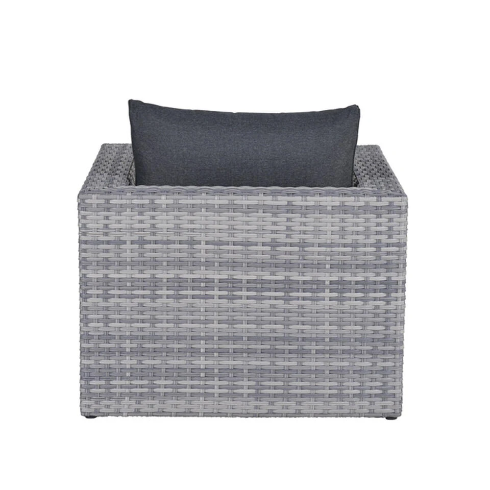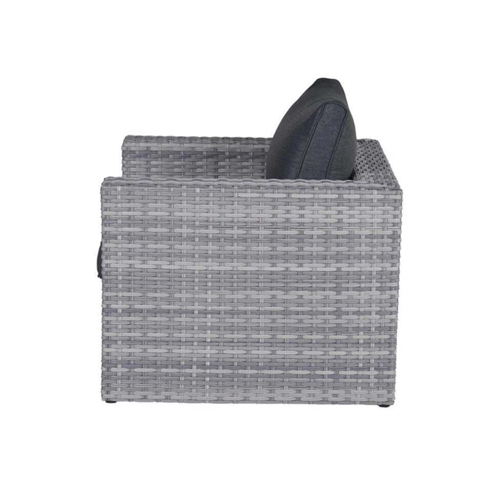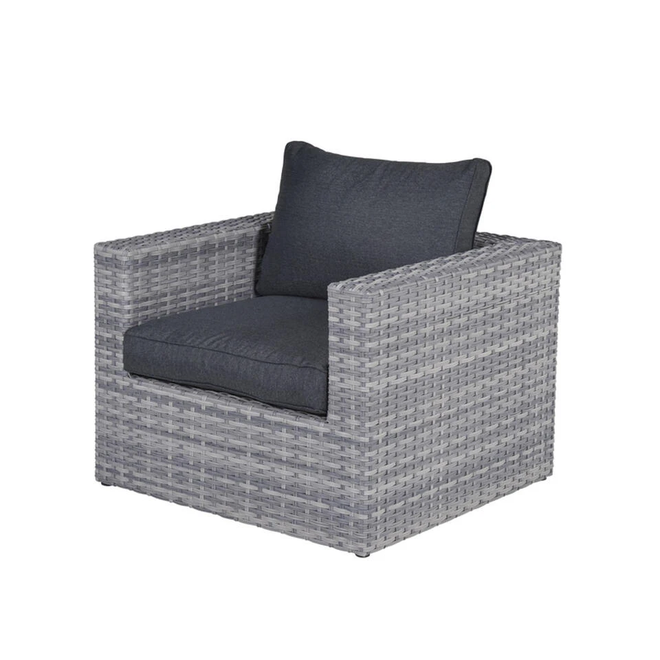 De Carlo lounge fauteuil beschikt over een aluminium binnen frame met hand gevlochten vlechtwerk draad daaromheen. Dit wicker, in de kleur cloudy grey, is gemaakt van stevig kunststof waardoor de lounge stoel zeer duurzaam is.
