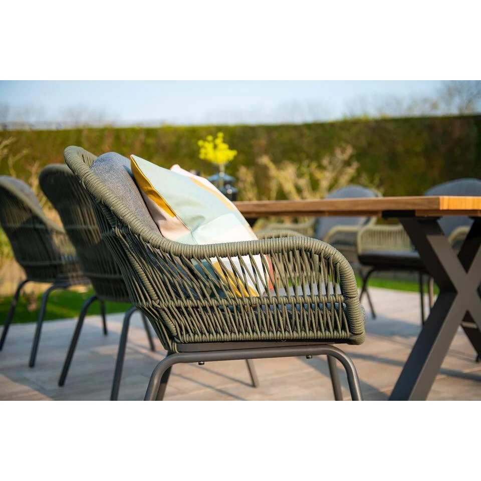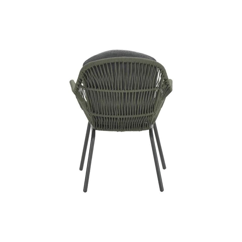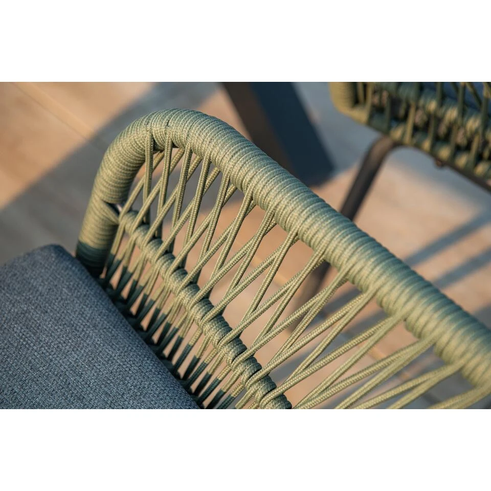 Deze stoel heeft een aluminium frame, waarop een beschermende poedercoating is aangebracht. In de rug en armleuningen zit Qualicord-rope. Dit is 5 mm. dik hoogwaardige kwaliteit mos groen gekleurd touw. Dit touw is te vergelijken met touw dat in de scheepsvaart wordt gebruikt. Het touw is voorzien van een rubberen kern binnenin met daarin meerdere polyester draden voor de stevigheid. Om de rubberen kern zit solution dyed polyster. Dit houdt in dat het touw door en door gekleurd is en hierdoor veel minder snel van kleur zag vervagen. De kussens zijn voorzien van een rits waardoor de hoezen gemakkelijk met de hand gewassen kunnen worden. Wij raden aan om de kussens na gebruik op te bergen in de schuur of eenopbergbox. De rug- en zitkussens hebben een waterafstotende coating. Hierdoor veeg je vocht er heel gemakkelijk weer vanaf. Wanneer de stoel bij jou thuis geleverd wordt dient alleen het onderstel nog gemonteerd te worden aan de bovenkant. Daarna kun je volop gaan genieten van deze prachtige stoelen.