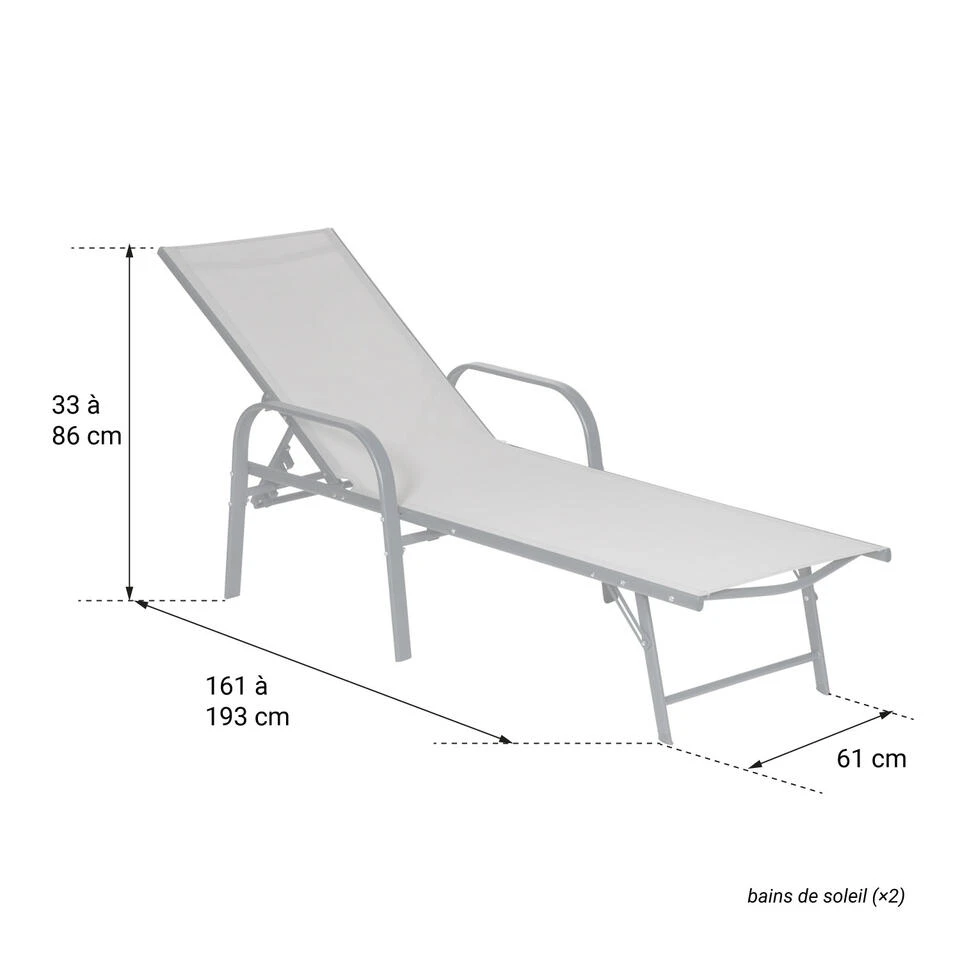 – Zonnebanken: L 161 tot 193 × B 61 × H 33 tot 86 cm