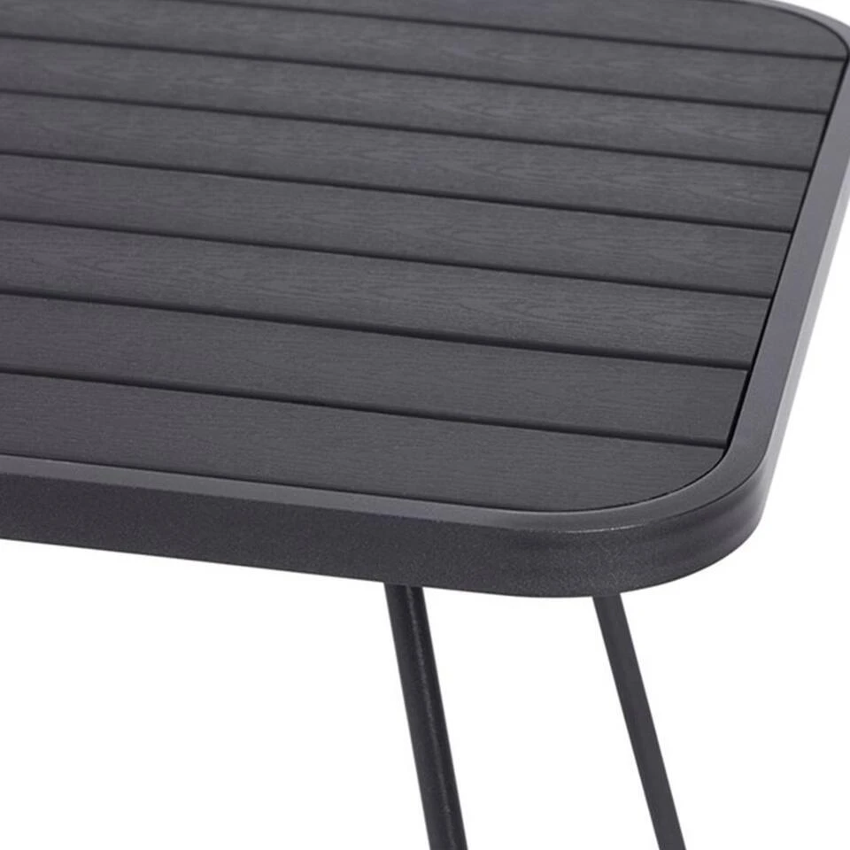 Het metalen onderstel vormt een modern contrast tegen het polywood tafelblad. Polywood lijkt op hout, maar is kunststof en is gebruiksvriendelijker in onderhoud. Je haalt er een licht vochtige doek over en de tafel is weer schoon. Let wel op: laat glazen niet te lang in de zon staan op een polywood tafel. Hierdoor kan een vergrootglaseffect optreden waardoor er smeltplekken ontstaan op het tafelblad. Ook hete voorwerpen zoals pannen kunnen niet direct op het tafelblad worden geplaatst. De tafel is gemakkelijk te verplaatsen, omdat hij licht van gewicht is. Zo kun jij gemakkelijk met de zon mee verplaatsen. Zie jij jezelf al heerlijk ontspannen met een verfrissend drankje?