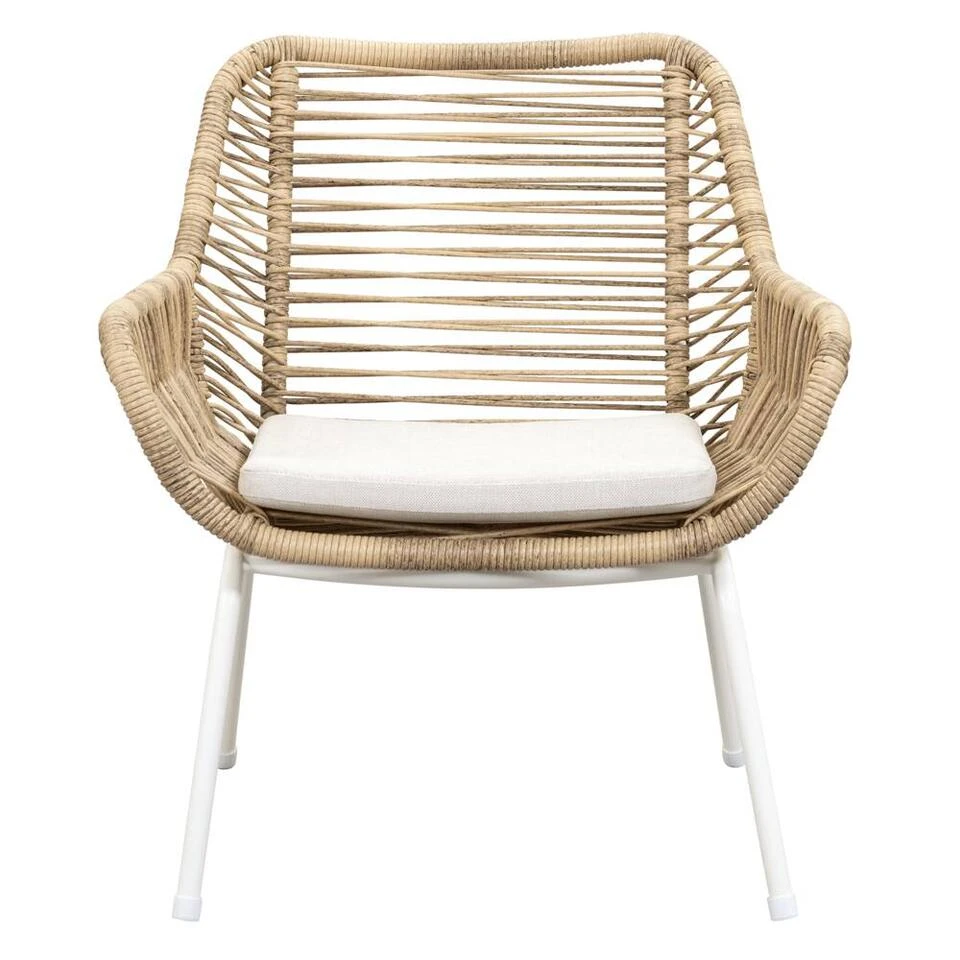 Loungefauteuil Grand heeft een metalen frame met een wicker zitting, rug- en armleuning in een naturel kleur. Het inbegrepen kussen is crèmekleurig en past perfect bij de natuurlijke uitstraling van de stoel. De fauteuil heeft een afmeting van 78x73x71 cm en kun je met mooi weer heerlijk in wegzakken.