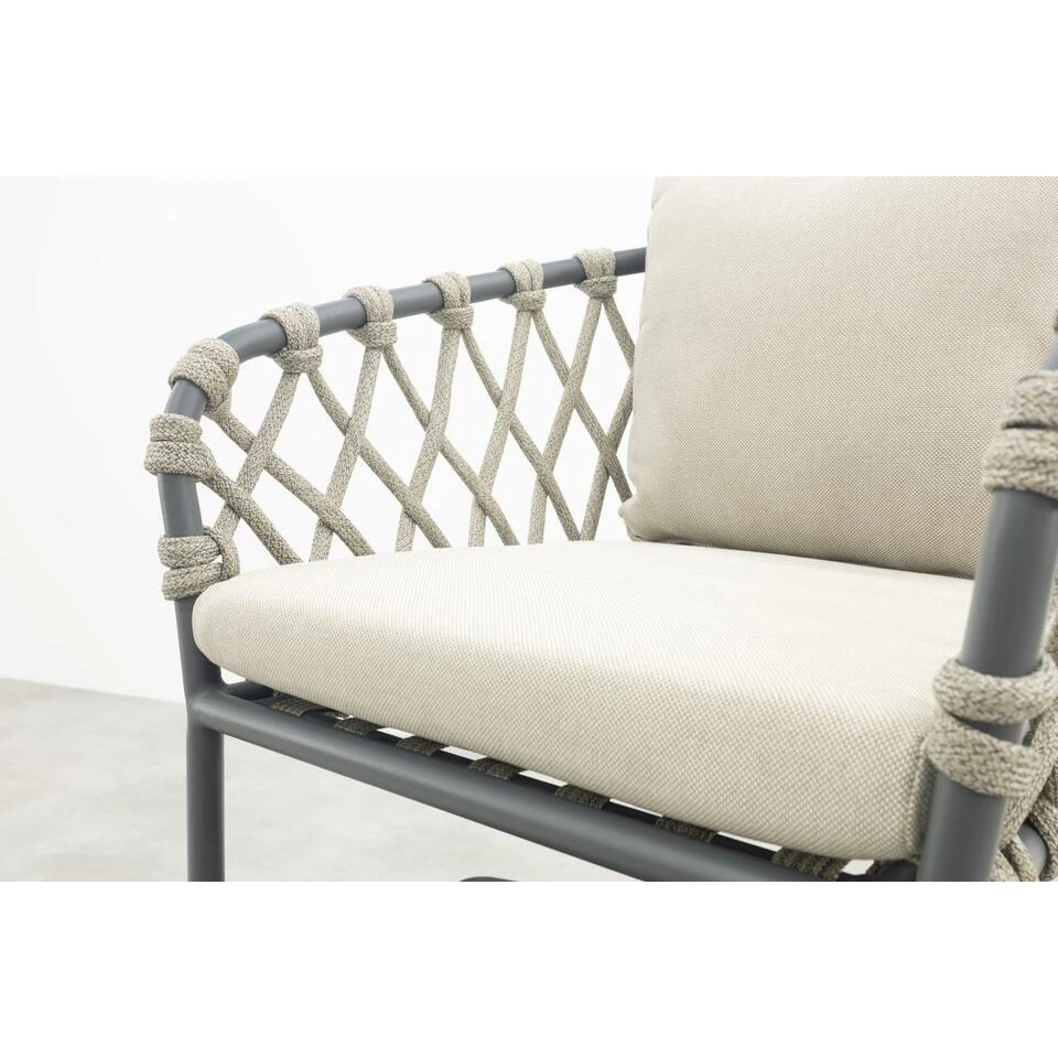 Deze stoel is licht van gewicht, weerbestendig en makkelijk te combineren met andere tuinmeubels. Het antracietkleurige aluminium frame zorgt voor een robuuste basis, terwijl het zandkleurige touw en de zachte kussens juist zorgen voor rust en comfort. Perfect voor een moderne tuin met een warme sfeer.