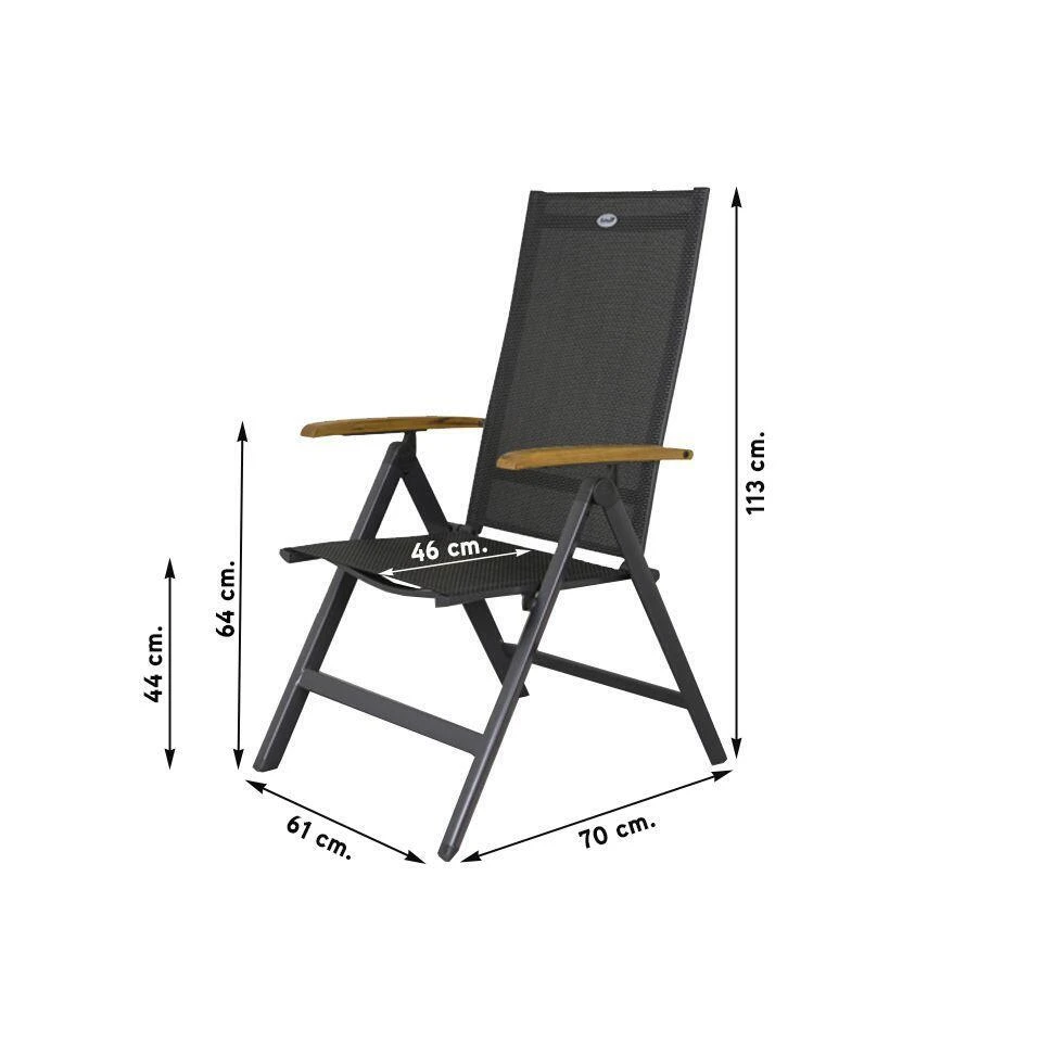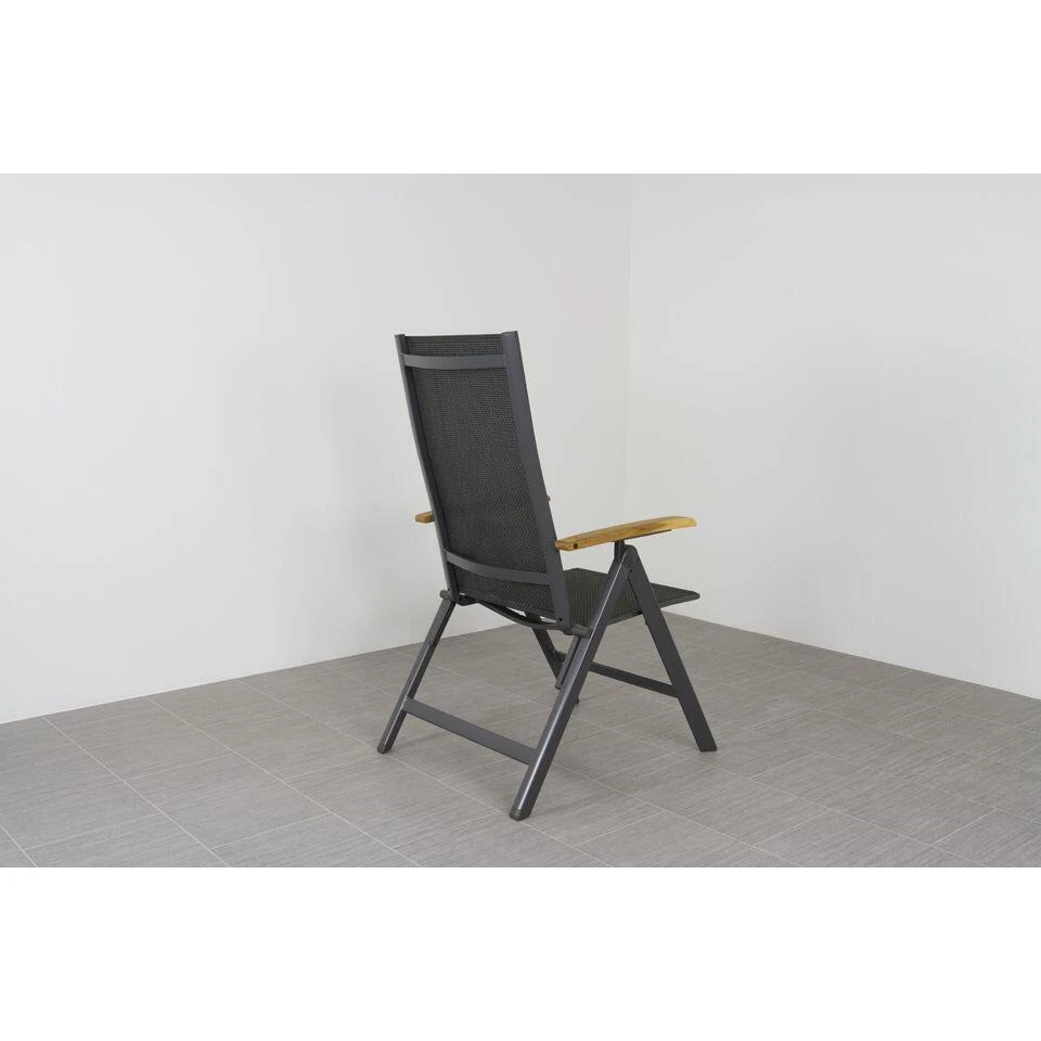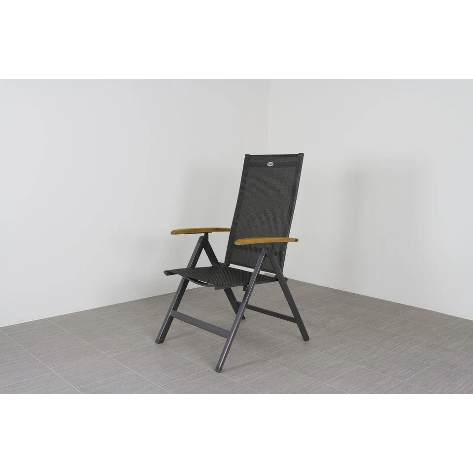 Deze verstelbare tuinstoel heeft een stevig aluminium frame en teak houten armleuning, tussen dit frame is een stevig textileen doek gespannen. Dit doek zorgt ervoor dat de stoel erg lekker zit. De stoel is in meerdere standen te stellen zodat deze perfect geschikt is om in te dineren en na het eten lekker in de relax stand te zetten. Het textileen doek is erg gemakkelijk schoon te maken.