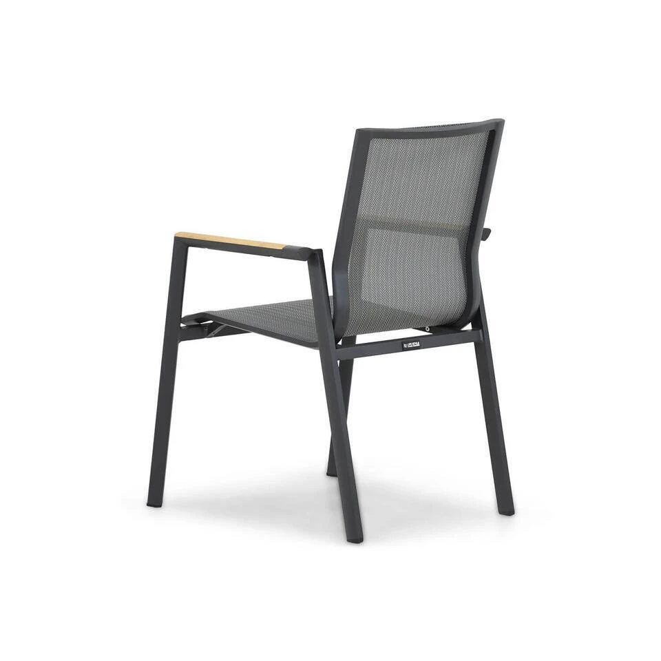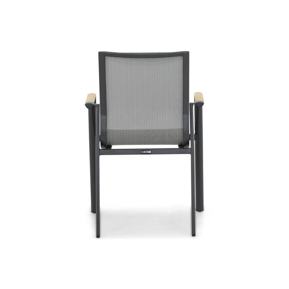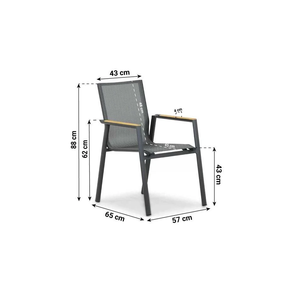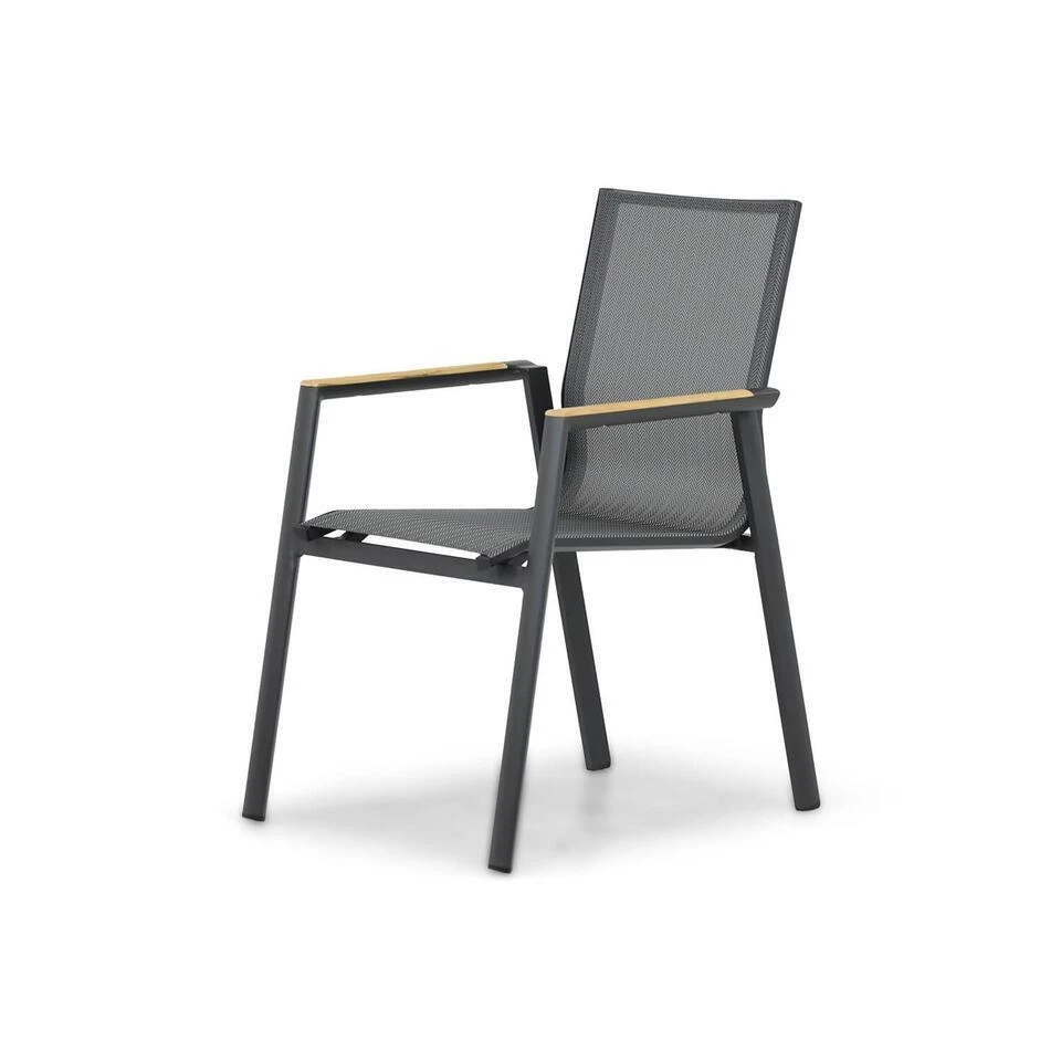 Lifestyle Fiora dining tuinstoel De Lifestyle Fiora dining tuinstoel is een eigentijdse, praktische tuinstoel. De tuinstoel is gemaakt van aluminium. Dit materiaal is lekker licht, zodat de tuinstoel zeer eenvoudig is op te tillen. Op de armleuningen is teakhout aangebracht, hierdoor ontstaat een mooie en warme onderbreking van het neutrale karakter van de stapelbare stoel. De zitting is gemaakt van textileen. Hierdoor heb je een comfortabel zitcomfort, omdat dit materiaal licht elastisch is. Benieuwd geworden? Kom dan snel langs en probeer het zelf uit! Eigenschappen Lifestyle Fiora dining tuinstoel De Lifestyle Fiora dining tuinstoel stapelbaar is gemaakt van duurzame materialen. Het frame van de tuinstoel is gemaakt van hoogwaardig aluminium. Dit materiaal heeft als voordeel dat het licht van gewicht en heel sterk is. Bovendien is het aluminium voorzien van een sterke poedercoat laag, waardoor de tuinstoel extra beschermd wordt. De antraciet kleur geeft de tuinstoel een stijlvolle en tijdloze uitstraling. De Lifestyle Fiora dining tuinstoel is eenvoudig stapelbaar en hierdoor makkelijk op te bergen of te verplaatsen. De rugleuning en zitting is omspannen met textileen. Dit is een kunststof materiaal wat volledig weersbestendig is. Daarbij is het een flexibel materiaal wat meevormt met je lichaam. Hierdoor ontstaat een optimaal zitcomfort. Op de armleuningen is teakhout aangebracht. Teak is een duurzame en zeer harde houtsoort. Na verloop van tijd gaat het hout natuurlijk vergrijzen. Dit draagt bij aan het eigen karakter van je tuinstoel. Als je het hout echter liever op kleur houdt, is het mogelijk om het met onze Garden Collections Teak Protector te onderhouden. Het gebruikte teakhout is voorzien van een keurmerk, wat een verantwoorde houtkap garandeert.