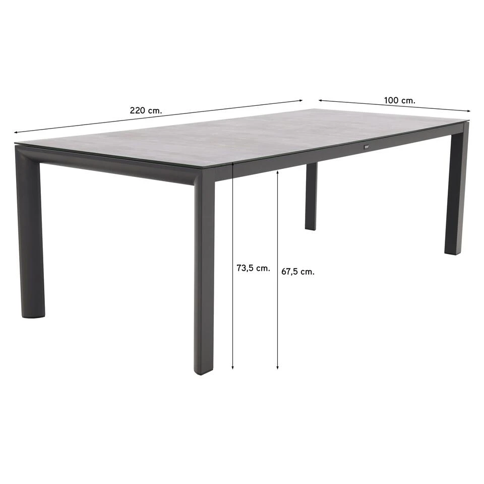 Het frame van de Baltimor dining tuintafel is gemaakt van aluminium. Dit materiaal is super sterk, heeft weinig onderhoud nodig en kan niet verroesten. Voor extra bescherming is het frame afgewerkt met een antracietkleurige coating welke kras- en stootvast is. Onder de tafelpoten zitten verstelbare dopjes zodat je de tafel waterpas af kunt stellen. Het tafelblad van de Baltimor dining tuintafel is gemaakt van “ceramic on glass”. Dit is een keramiek laagje dat op een geharde glasplaat is aangebracht. Dit materiaal is krasvast en eenvoudig in onderhoud. Schoonmaken met een vochtig doekje volstaat. Daarnaast is het blad hitte- en uv-bestendig.