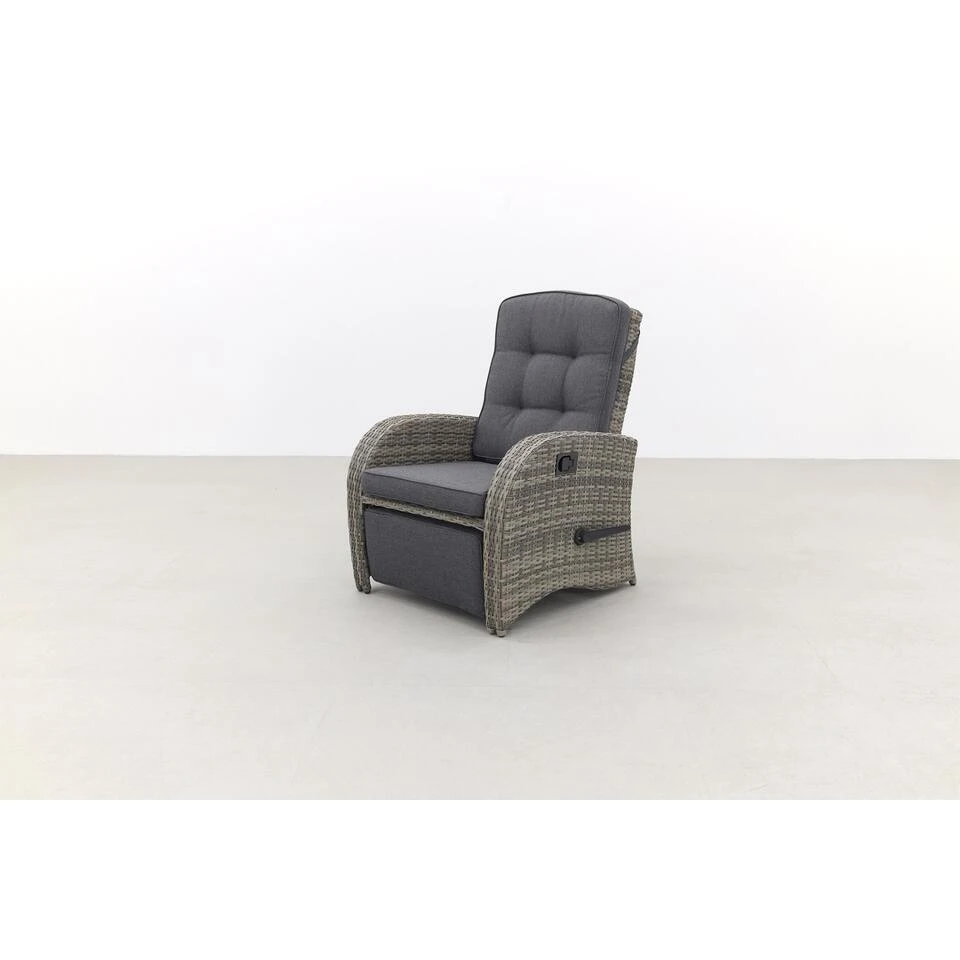 Het frame van de Verstelbare loungestoel Casblanca is van aluminium. Dit materiaal is licht van gewicht, erg stevig en onderhoudsvriendelijk. Om dit frame is het kunststof vlechtwerk gevlochten. Dit wicker is uitgevoerd in de kleur Light grey. Het draad wordt ook wel 2-ply wicker genoemd en is heel sterk. De kussens van de Verstelbare loungestoel zijn grijs van kleur, dit combineert erg mooi bij het vlechtwerk.